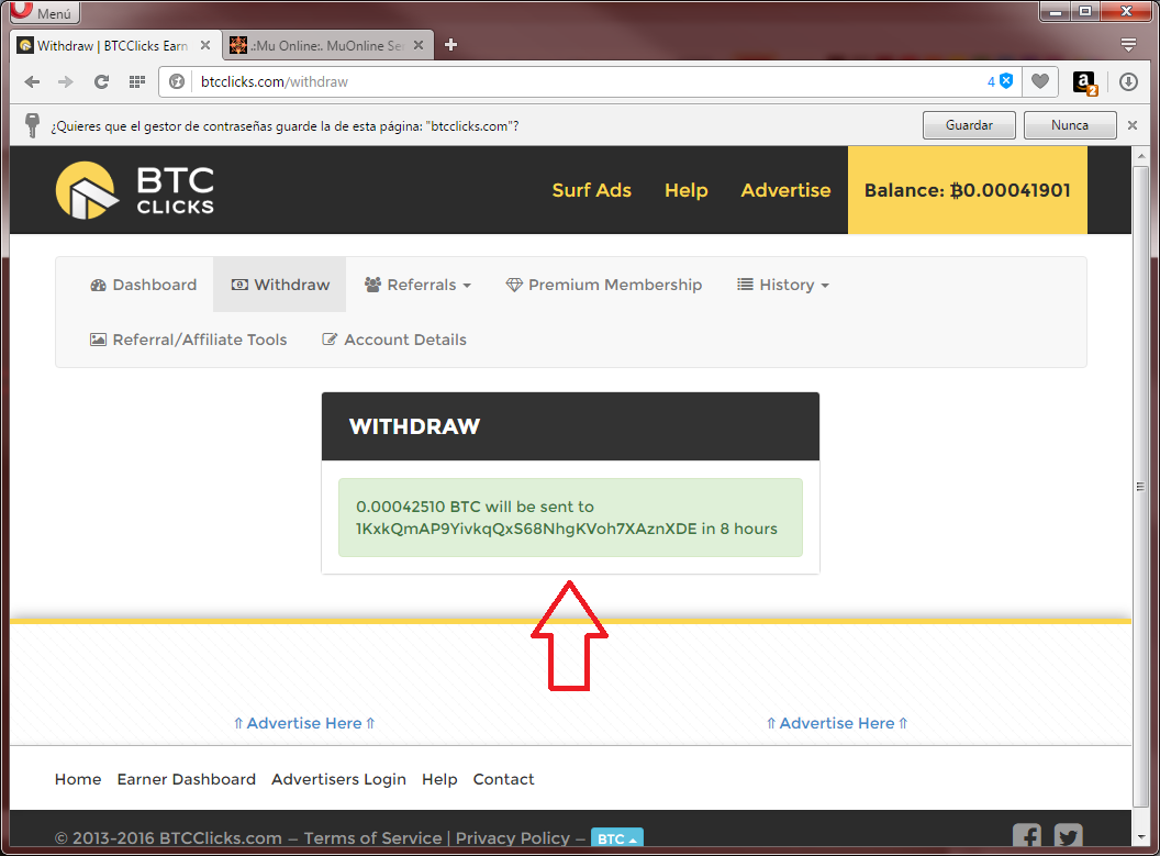 Nota : Este proceso se hace todos los dias para ir acumulando BTC y asi hace el retiro de los fondos ganados o acumulados en los siguientes dias cuando se hayan acumulado mas de 0.00010000 BTC en el saldo.